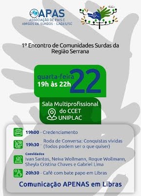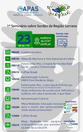 1. A APAS agradece seu apoio na divulgação deste evento tão importante para Lages e demais municípios da região. Um evento pioneiro pioneiro que debaterá a temática da surdez, educação e importância da Língua Brasileira de Sinais – Libras como um caminho de oportunidades buscando garantir de fato a inclusão e garantia de direitos da pessoa surda.