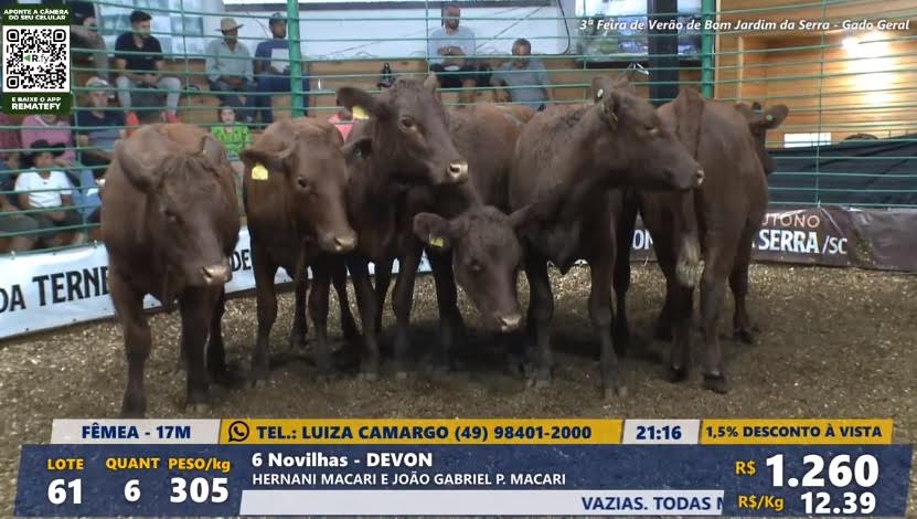 Os leilões na serra catarinense começaram com os preços em alta para a raça Devon. Um lote de seis novilhas padrão, todas mochas e com peso médio de 305 kg, com até 17 meses, alcançou média de R$12,39/kg, a mais alta na 3ª Feira de Verão de Bom Jardim da Serra (SC), realizada no último sábado (2 de março). A média geral das novilhas foi de R$ 9,06. O Remate foi o primeiro de uma série de eventos que vão movimentar a Serra Catarinense nas próximas semanas. O crescimento nos negócios acontece após um período de estabilidade do setor.