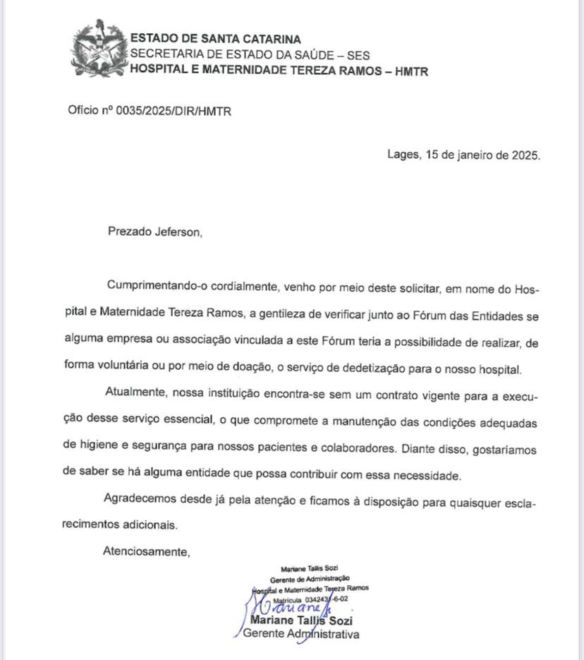 Vejam só a situação: a direção do hospital Tereza Ramos não previu a dedetização, algo considerado essencial em uma unidade de saúde. Esqueceram de fazer a licitação? E, agora vêm pedir para os empresários custearem. Recentemente já foi feita a pintura. Daqui a pouco vão pedir para a Acil também contratar os médicos. Isso que o governador disse que iria “mandar dinheiro de balaio para Lages”.
