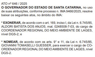 Em princípio, a ideia da prefeita Carmen Zanotto era chamar  Giovanni Tomazelli Guesser paraa executivo do Meio Ambiente, com a tarefa de implantar o Instituto do Meio Ambiente de Lages. Por isso vi, com surpresa, o ato do governador publicado no Diário Oficial de hoje, exonerando o atual coordenador regional do Meio Ambiente em Lages, Aldoria Batista dos Anjos para nomear ,em seu lugar Giovanni Guesser.