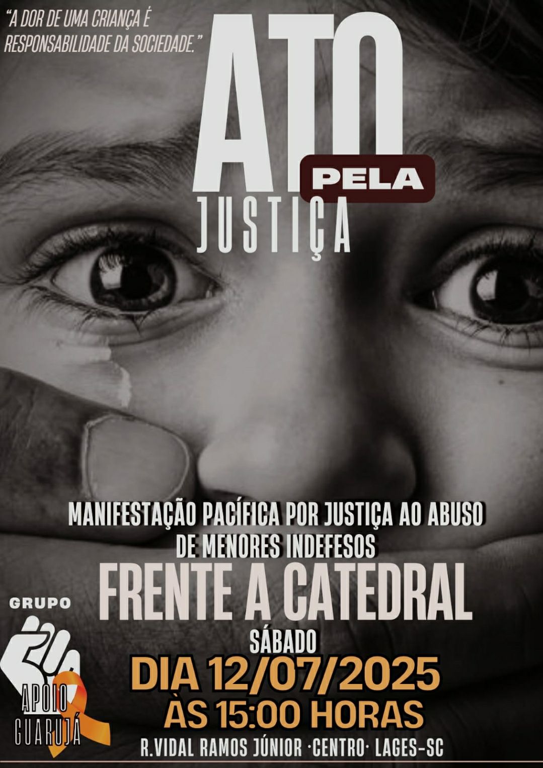 Acho que a frase do cartaz está errada ” A dor de uma criança é responsabilidade da sociedade. Acho que seja de responsabilidade do Conselho Tutelar que deve investigar o caso, do Ministério Público que deve aceitar a denúncia investigar e punir a sociedade deve denunciar caso saiba do ocorrido. Geralmente o estubrador está em casa ou no território da Criança e neste caso o abusador estava na Igreja que deveria proteger, amparadas. Geralmente o protetor abusador então em que confiar. E um Bispo é o Padre Hermes da Cúria recebe abaixo assinado para retirar o padre da comunidade antes do ocorrido nada fez para verificar o perfil deste padre que segundo a comunidade o padre já respode pela mesma ocorrência em outras comunidade- cidade da região. Perguntado ao bispo ele alegou não saber o perfil do padre. Então este padre já apresentava desvio de conduta. Se é verdade essa acusação do Padre estar respondendo por outros estupro porque não esta respondendo agora chegou ao segundo fato . Então a responsabilidade é os meios de segurança.