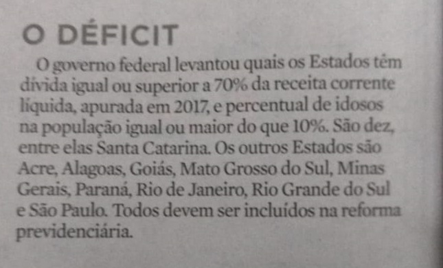 SC: Dívida superior a 70% da receita corrente líquida 5 de junho de 2019 Por Olivete Salmória Coluna Moacir Pereira/Edição do NSC/DC de 05/06/2019 Constata-se que o estado não está com as finanças tão boas como apregoava o seu gestor anterior.