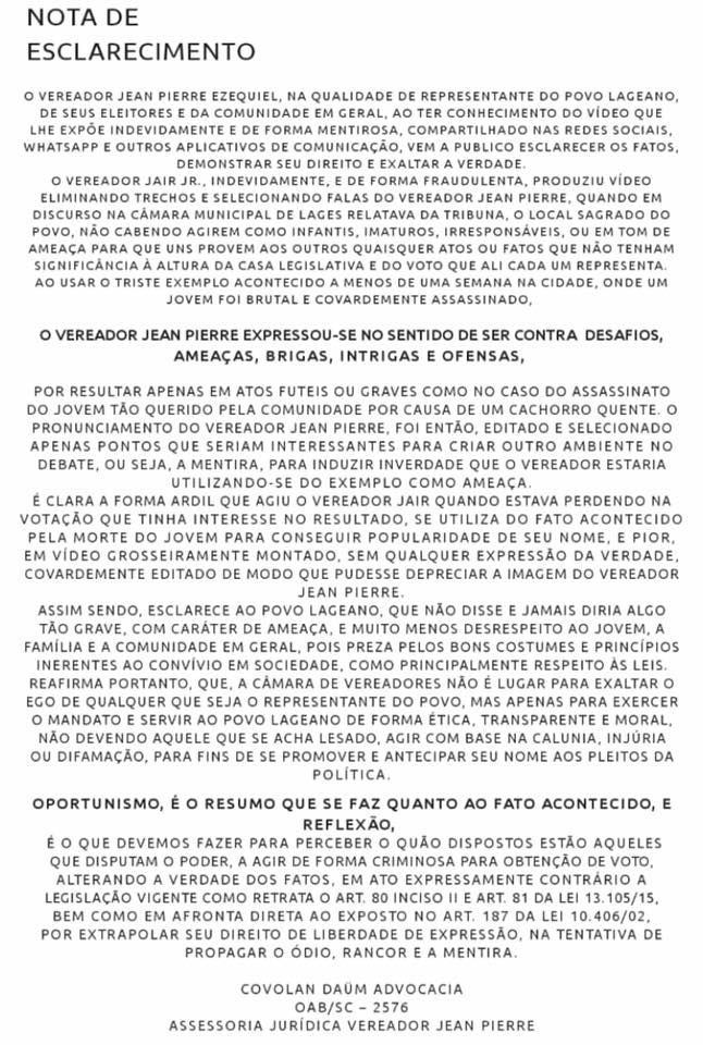 Nota expedida pelo vereador Jean: