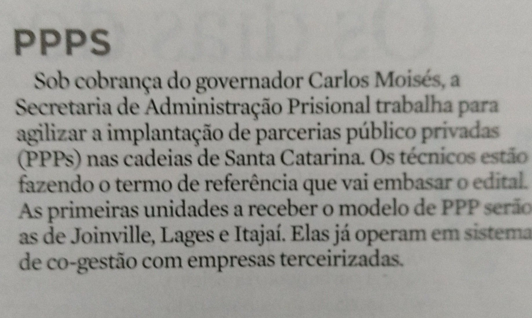 Parceria público privada nas cadeias de SC, incluindo a de Lages 8 de julho de 2019 Por Olivete Salmória Colunista Anderson da Silva, NSC/DC de 08.07.2019