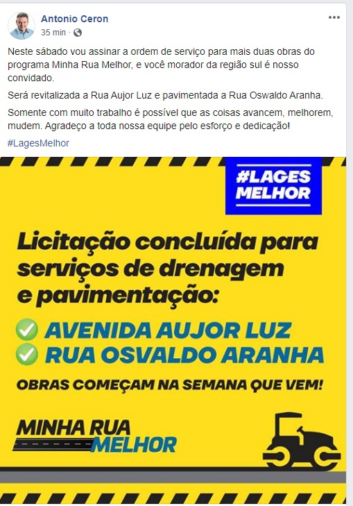 3 comentários em “Ceron fará a entrega de mais duas ordens de serviço”