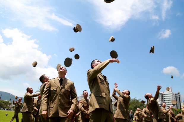 A cerimônia dos 241 novos militares da instituição lotou o Centro de Ensino da PM, na Trindade, em Florianópolis.