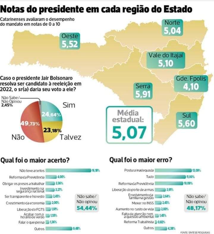 No entanto, a pior avaliação do presidente ocorreu na Grande Florianópolis, com nota média de 4,10. As melhores médias do presidente da República, com nota 8, foram obtidas no Sul e no Oeste. Além disso, nas demais regiões, Bolsonaro obteve as seguintes médias: Sul (5,60), Vale do Itajaí (5,10), Norte (5,04) e Oeste (5,52).
