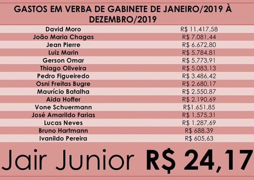 Vereador Jair Júnior divulgou nas redes sociais os gastos dos vereadores apenas com verba de gabinete. O recordista foi o vereador David Moro que gastou mais de R$ 11 mil no ano. Jair foi o que menos gastou: apenas R$ 24,17.