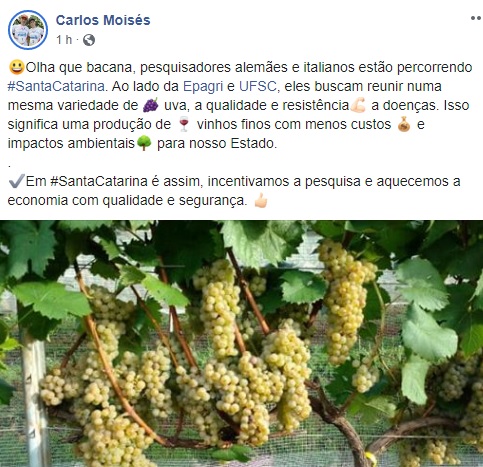 Postagem do governador a respeito da produção de uva e vinho em SC 31 de janeiro de 2020 Por Olivete Salmória