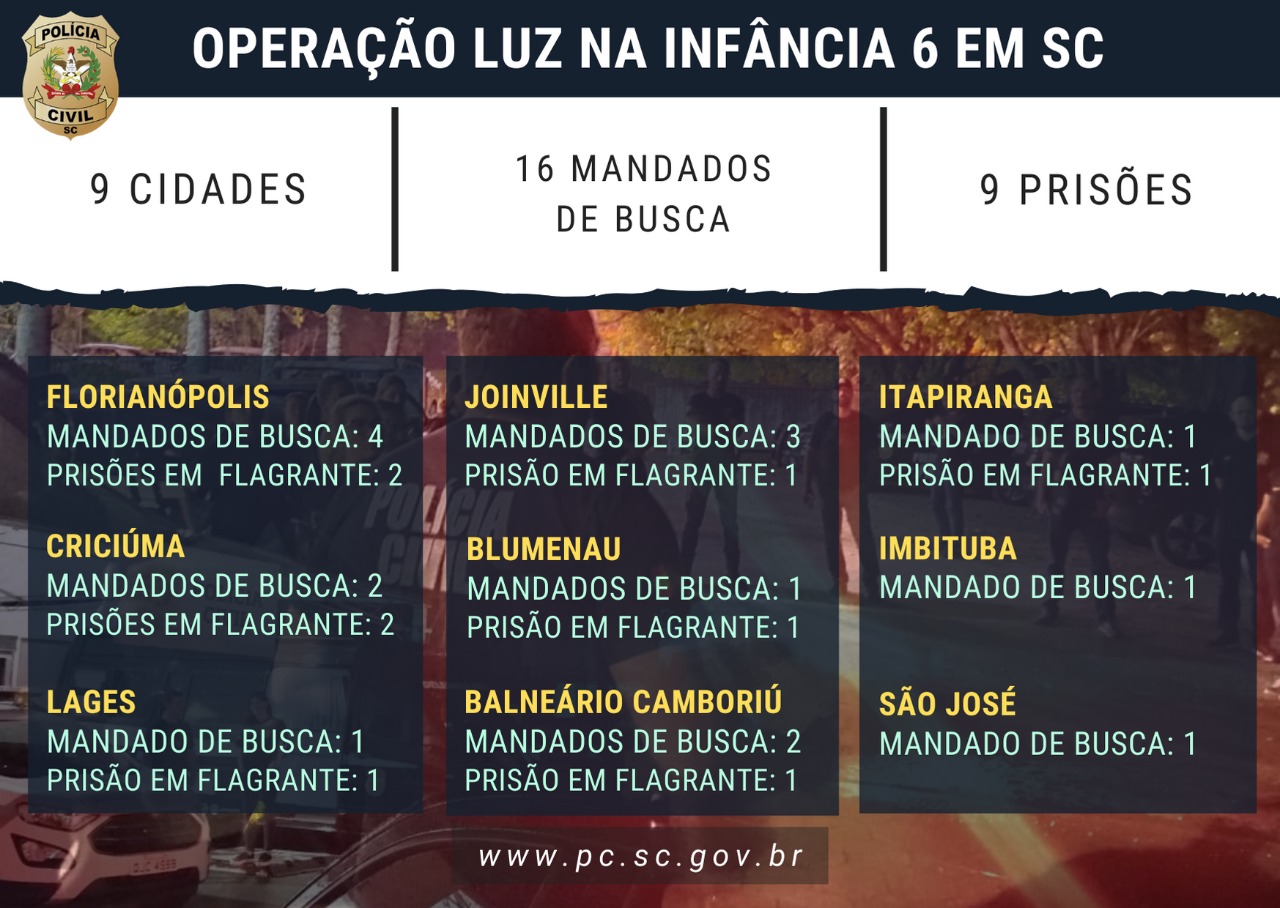 A Polícia Civil de Santa Catarina realiza, nesta terça-feira (18), a Operação Luz na Infância 6, que cumpre 16 mandados de busca e apreensão no Estado. A força-tarefa nacional coordenada pelo Ministério da Justiça e Segurança Pública (MSP) envolve polícias civis de 12 Estados. Além do mais, agentes de aplicação da lei da Colômbia, Estados Unidos, Paraguai e Panamá estão cumprindo, simultaneamente, mandados de busca e apreensão.