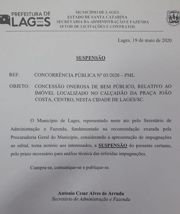 Esta suspensão se deve ao pedido de impugnação protocolado pelo Observatório Social e CDL da licitação do livraria e cafeteria do calçadão. Eles estenderam que a licitação estaria sendo prejudicada porque uma mesma pessoa tinha de assumir os dois serviços.