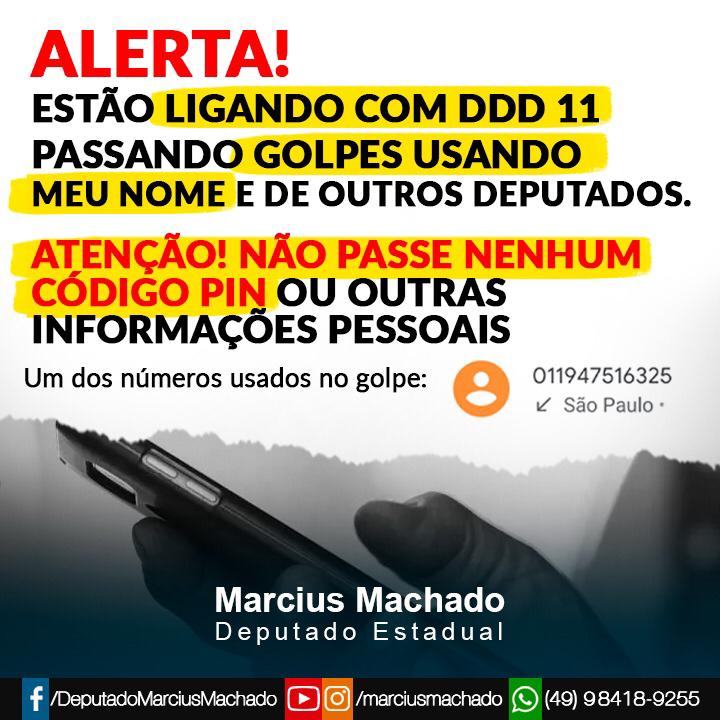 A Assembleia Legislativa alerta a população para um golpe que vem sendo aplicado usando indevidamente o nome de deputados estaduais catarinenses. Conforme já narrado em boletins de ocorrência registrados na Polícia Civil, golpistas – se fazendo passar por assessores de deputados – telefonam para contatos do relacionamento pessoal ou político dos parlamentares convidando para uma festa e pedindo a confirmação de presença por meio de um código que será enviado através de SMS.