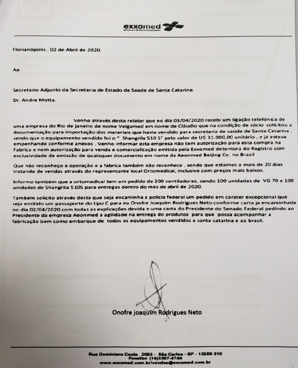Hobus mostrou documento enviado à Secretaria de Saúde, em 2 de abril, da Exxomed, representante da fabricante chinesa que produz os respiradores comprados pelo Estado por meio da Veigamed. A empresa destaca a Veigamed  não tem autorização para venda ou comercialização e que os preços pagos por Santa Catarina estão mais altos.