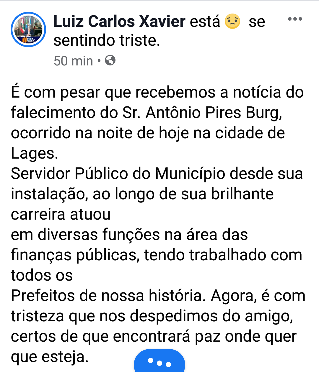 Oliveira Pires Burk comunica o falecimento de seu irmão Antonio Pires Burk, secretário da prefeitura de Otacílio Costa. Ele estava com 70 anos.
