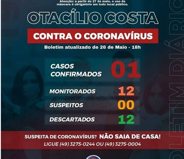 Há um caso confirmado no município de Otacílio Costa, embora dos 12 suspeitos restantes não tenha acusado o coronavírus em nenhum. O infectado veio de fora do município. O prefeito Luiz Carlos Xavier (Tio Ligas) decidiu estabelecer uma multa para quem não usar máscara, mesmo na rua.