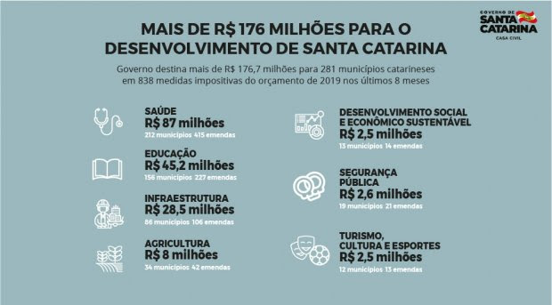 O Governo de Santa Catarina, por meio da Casa Civil e da Secretaria de Estado da Fazenda, destinou mais de R$ 176,7 milhões nos últimos oito meses para pagamento de 838 emendas impositivas de 2018, previstas no Orçamento de 2019, que beneficiaram diversas áreas. A verba atende diretamente 281 municípios espalhados por todas as regiões de Santa Catarina. Os recursos foram solicitados por 40 deputados e ex-deputados estaduais.