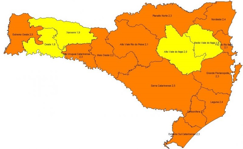 No mapa divulgado ontem pelo governo de SC a região da Serra volta à classificação laranja. Isso significa que retrocedemos em função das mortes verificadas nos últimos dias. Embora o número de contaminados tenha reduzido, as mortes continuam ocorrendo. Só em Lages já são 78 e na região 38, totalizando 118 óbitos.