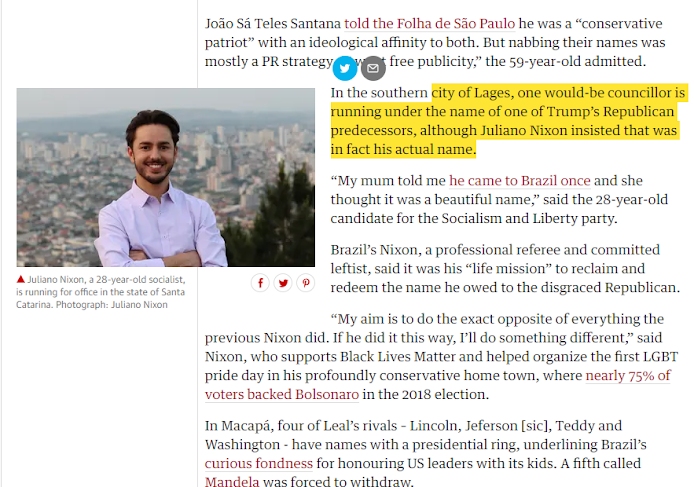 Em uma curiosa matéria que compara os nomes de candidatos a vereadores Brasil a fora com grandes personalidades da política mundial, destacou o nome e o propósito do candidato a vereador o PSOL de Lages, Juliano Nixon. A matéria foi publicada no site do jornal britânico The Guardian, dando gancho para uma segunda pauta, dessa vez mais “local” no jornal Estadão de São Paulo.