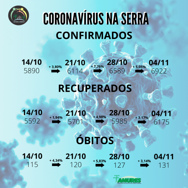Novembro começa com estabilização em alta, do percentual de casos de Covid-19 na Serra Catarinense, segundo levantamento semanal realizado pelo setor de Comunicação da Amures. Pelos dados finalizados às 11h desta quarta-feira (04), as informações compiladas junto às Secretarias Municipais de Saúde apontam para um total de 6.922 casos confirmados, 6.175 pacientes recuperados e 131 casos fatais.