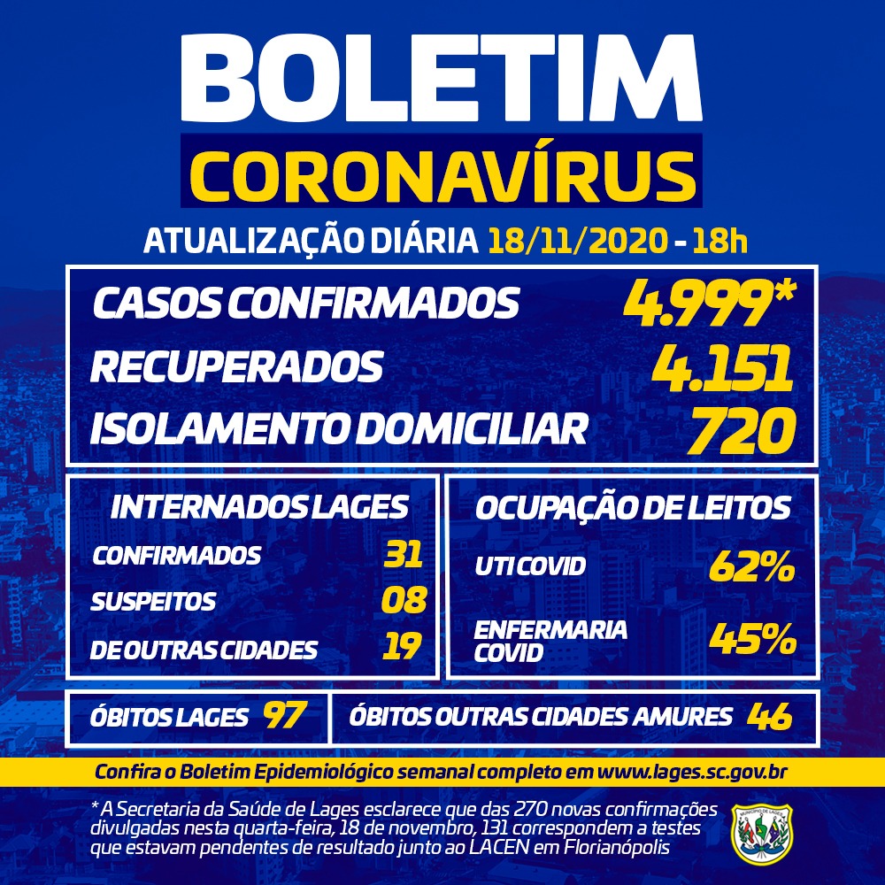 97 óbitos só em Lages 18 de novembro de 2020 Por Olivete Salmória ⚠️ Comunicado ⚠️ A Secretaria da Saúde de Lages esclarece que das 270 novas confirmações divulgadas nesta quarta-feira, 18 de novembro, 131 correspondem aos testes que estavam pendentes de resultado junto ao LACEN em Florianópolis.