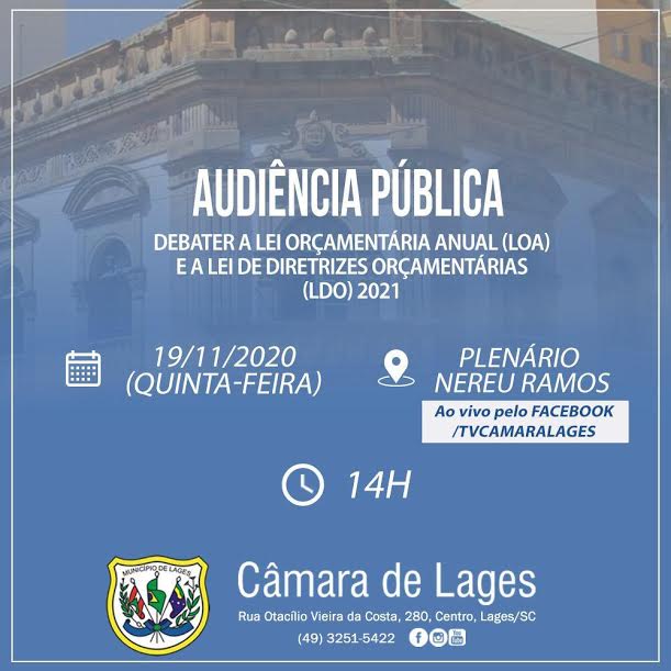 Acontece nesta quinta-feira (19), de maneira remota como forma de minimizar o contágio do Novo Coronavírus, duas audiências públicas que tratam do Orçamento 2021 da Prefeitura de Lages. Você pode comentar, sugerir, cobrar, reivindicar melhorias ao Orçamento ao participar da nossa live, com início às 14h.