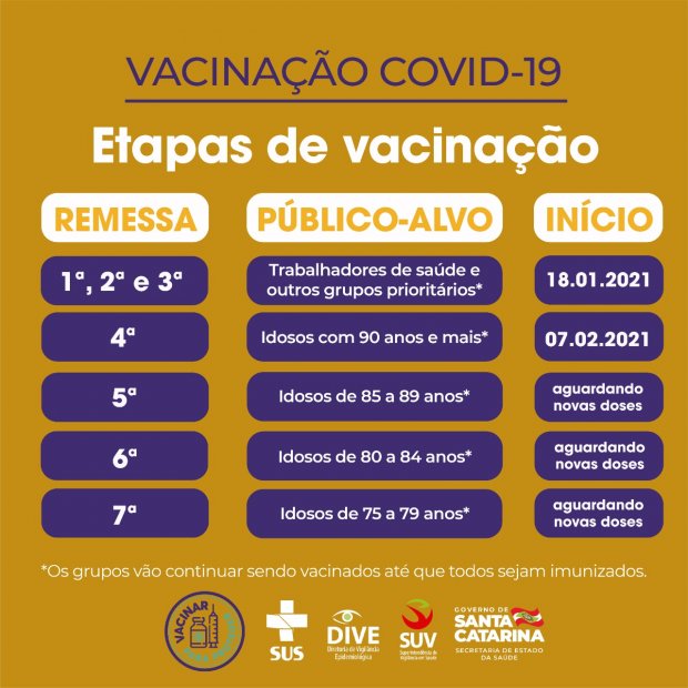 A secretaria da Saúde continua também vacinando o pessoal da saúde com as 3.400 doses que recebeu até agora. Destas, já aplicou até o final de semana cerca de 1.900. Portanto continua a vacinação desta primeira fase, do pessoal que atua na área da saúde, que em Lages somam cerca de 6 mil profissionais.