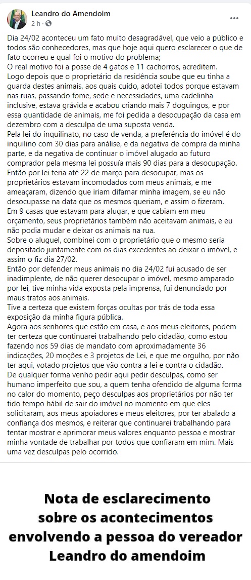 O L do Amendoin vai querer se fazer de vítima agora, se nem a a sua obrigação de pagar pontualmente o aluguel o mesmo cumpriu? Viu que fez besteira e agora quer transferir a sua a culpa aos proprietários do imóvel que precisam vende-lo e o inquilino se nega a desocupa-lo? Essa justificativa de proteção aos gatos e cachorros não colou. Quais seriam as forças ocultas ditas pelo edil?