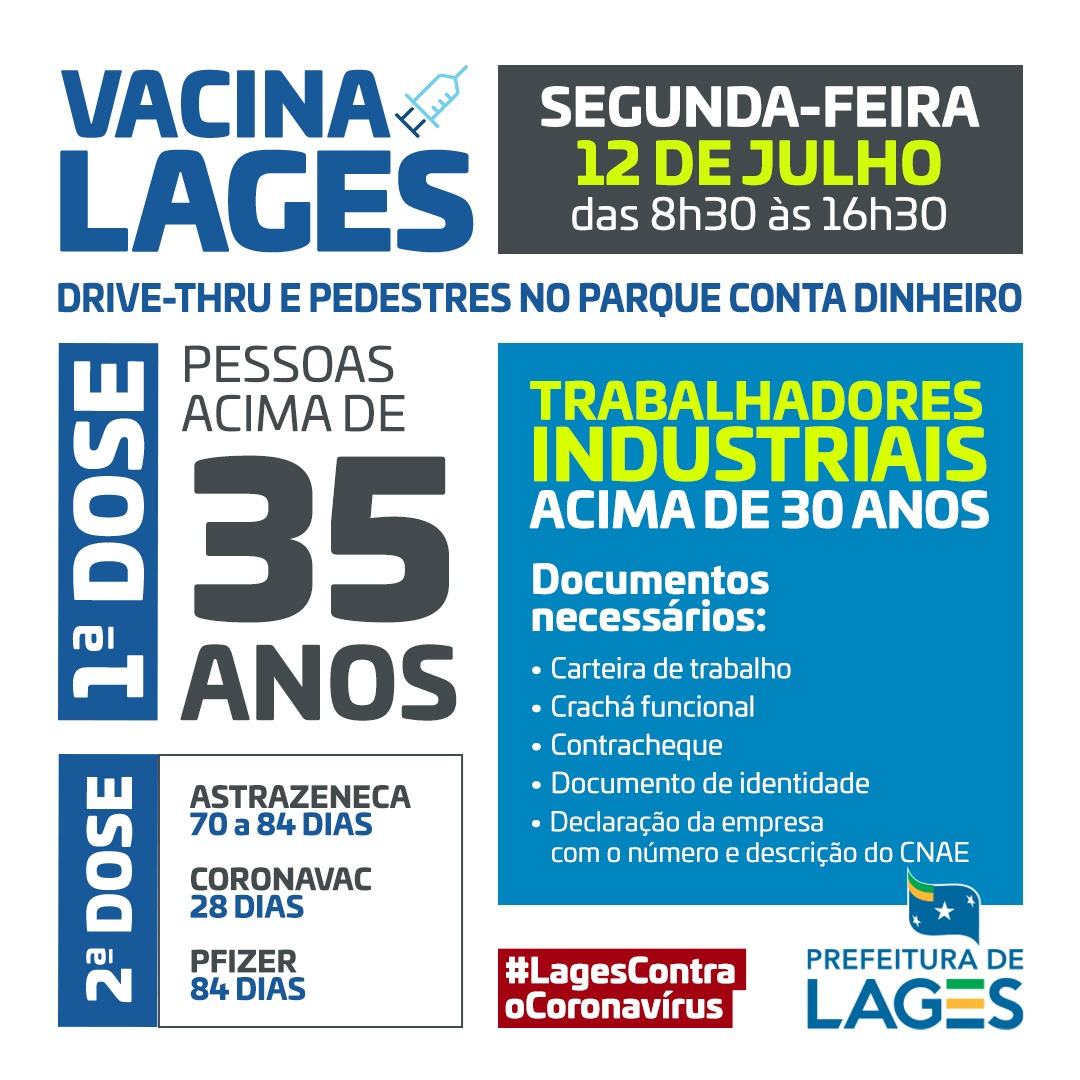 Após o recorde de 3.090 doses aplicadas em um só dia em Lages, no último sábado, a vacinação para esta segunda-feira tem um novo grupo etário para os trabalhadores da indústria. Os trabalhadores com 30 anos ou mais podem se vacinar contra o Coronavírus, nesta segunda-feira, das 8h30min às 16h30min, no parque Conta Dinheiro, no sistema drive thru ou para pedestres.