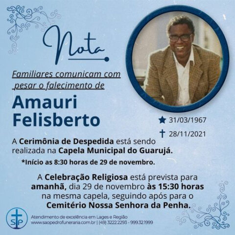 Falecimento de Amauri Felisberto 29 de novembro de 2021 Por Olivete Salmória Durante muitos anos Amauri Felisberto foi o responsável por preparar os modelos, inclusive treinando as participantes dos concursos da Festa do Pinhão. Amauri faleceu ontem (28) e foi sepultado nesta manhã de segunda.