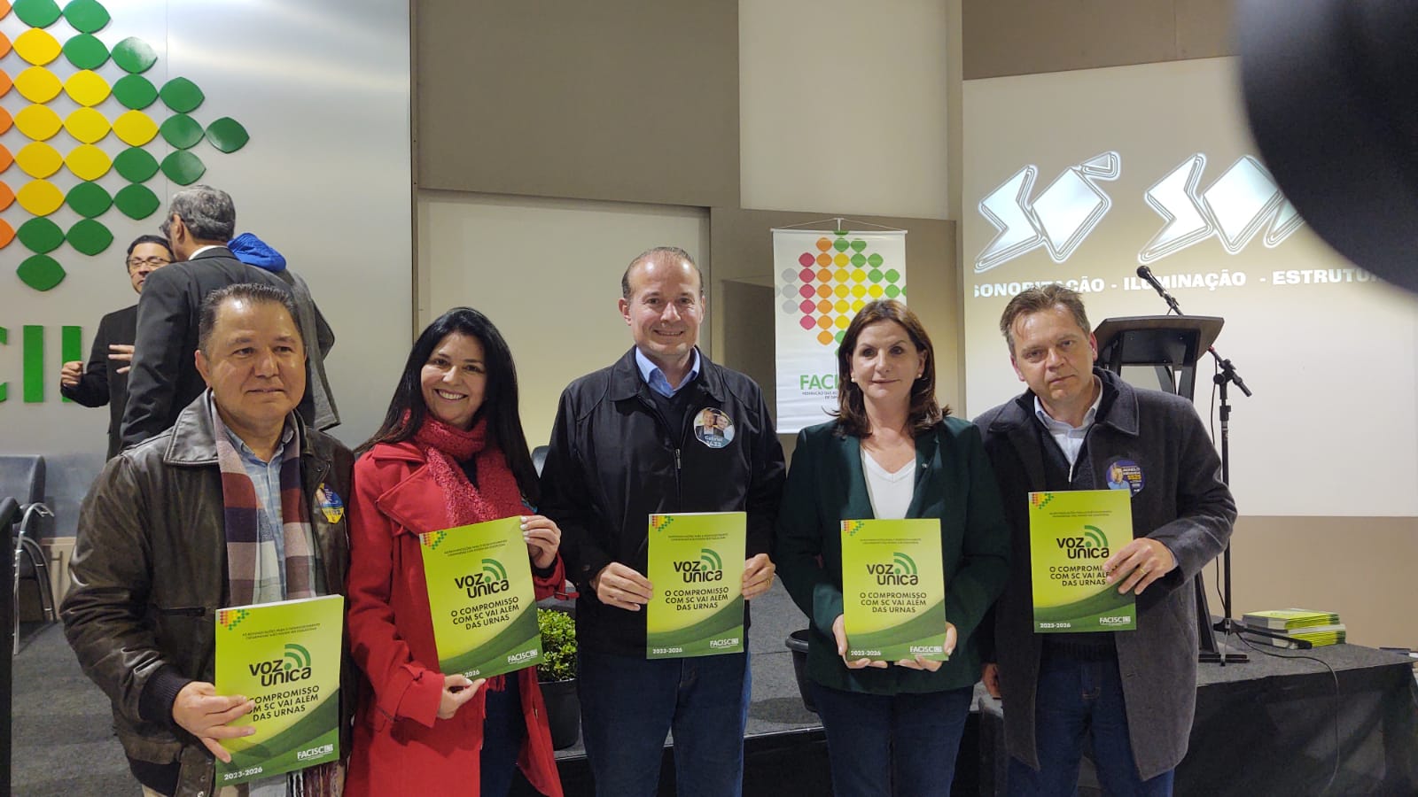 Os candidatos a deputado federal pela Serra: Almir Bitencourt (Republicanos), Slvia Oliveira (PP); Gabriel Ribeiro (PTB), Carmen Zanotto (Cidadania) e Agnelo Miranda (PSD). Eles estiveram ontem (19) no evento da Facisc para a entrega da Cartilha Voz Única, contendo as reivindicações da Serra.