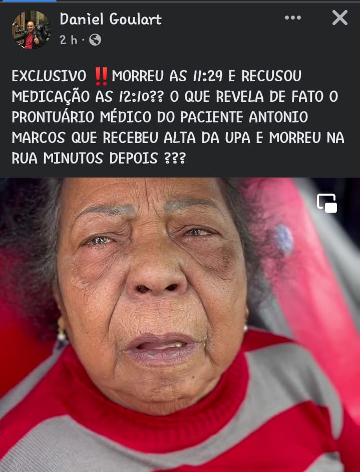 Esposa de Marco Antônio diz que o marido foi para a UPA porque estava com dor no peito. Lá recebeu a receita para tratamento de gastrite e foi mandado para casa. Ele não quis tomar o omeprazol receitado. Pontuário aponta que ele foi atendido às 12h10, sendo que ele faleceu às 11h29, apurou o repórter Daniel Goulart