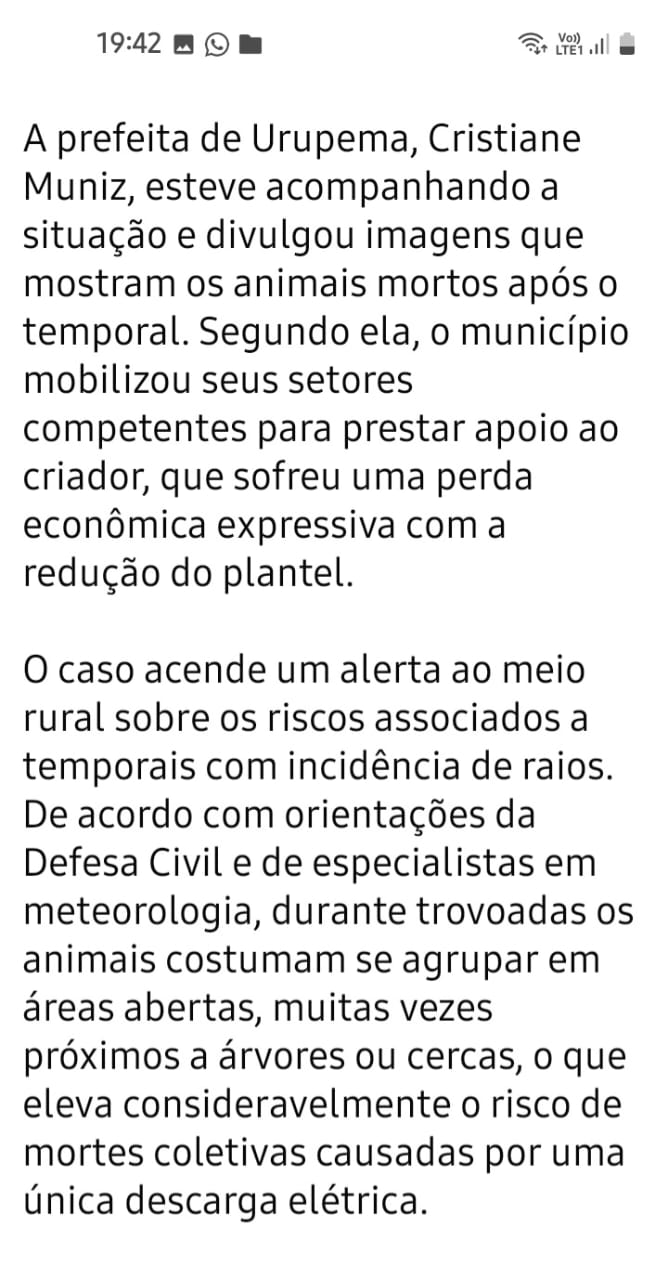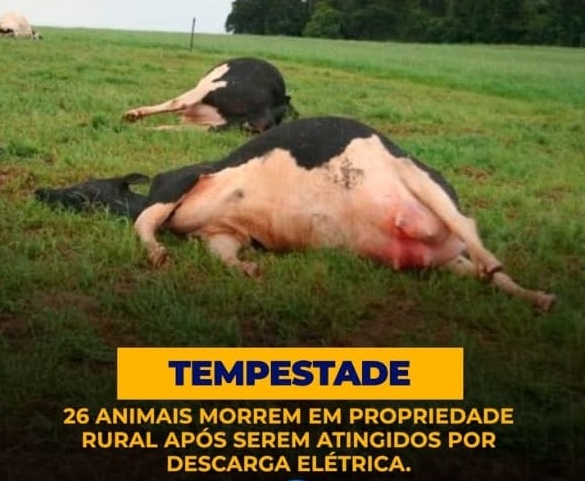 Uma forte trovoada resultou na morte de 26 bovinos na localidade de Rio dos Touros, interior de Urupema, no último dia 8 de janeiro. Os animais foram atingidos por descargas elétricas durante o temporal que atingiu a Serra Catarinense. O prejuízo foi registrado em uma única propriedade rural da região.