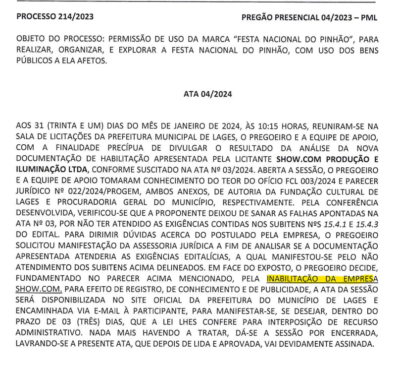 A prefeitura deu um prazo para a empresa Show.com, apresentar documento comprovando estar habilitada para realizar eventos do porte da Festa do Pinhão e ela não apresentou. Portanto, não cumpriu as exigências impostas no edital e está fora de cogitação a sua contratação.