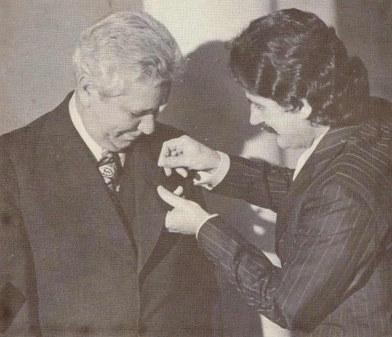 Colombo Machado Salles recebendo o distintivo do Ministério Público, do presidente da Associação do Ministério Público, Aloysio de Almeida Gonçalves, em 1974