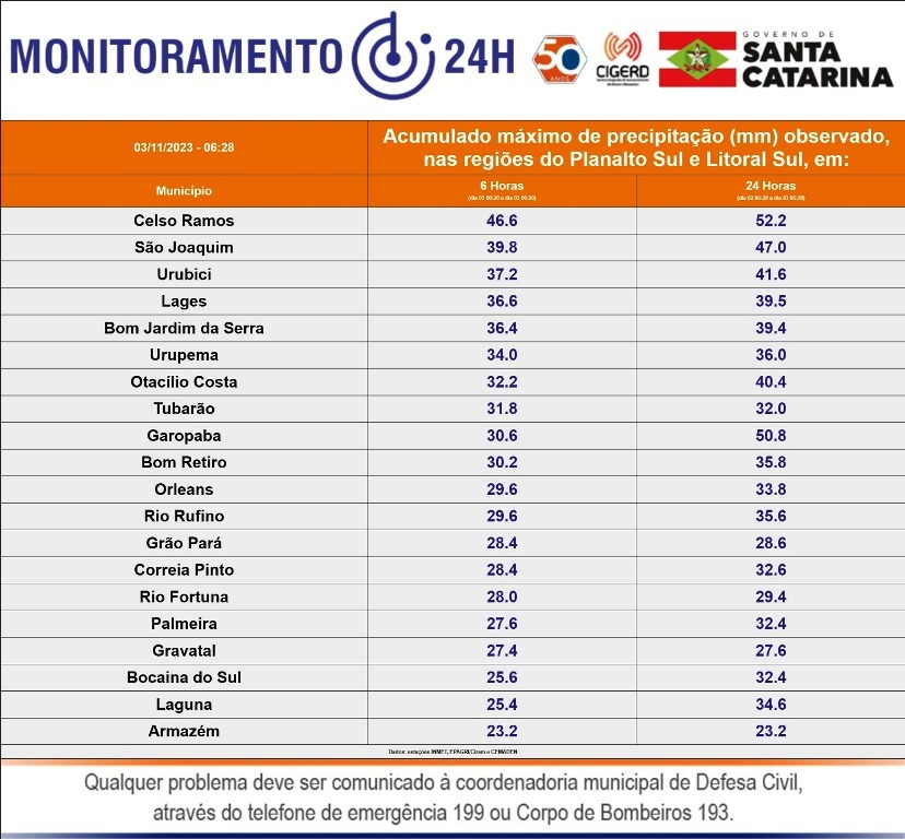 A Defesa Civil Municipal está monitorando as condições climáticas, que apontam precipitação pluviométrica de 37.4 mm nas últimas 24h. O registro foi feito às 9h desta sexta-feira (03), sendo que na estação hidrológica a medição do Rio Carahá apontava 3,19m.