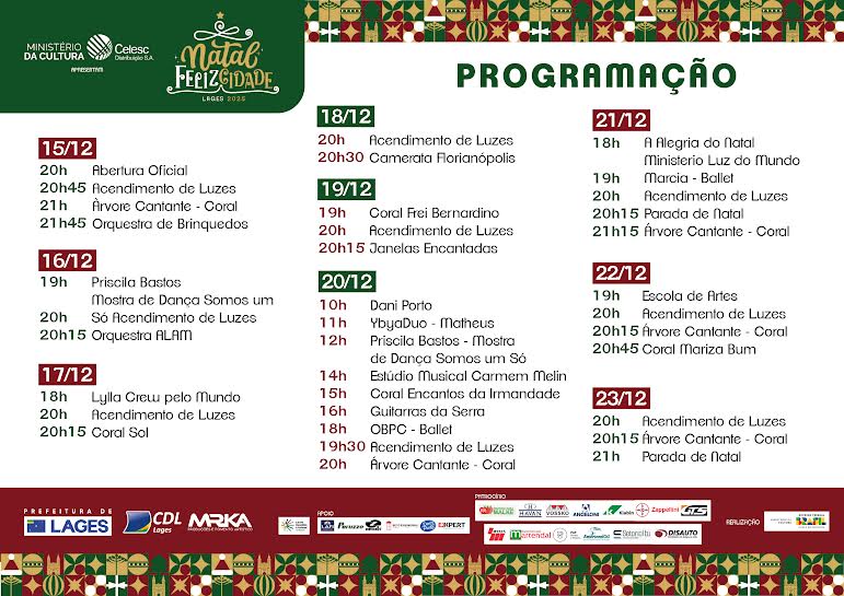 Já nos dias 21 e 23, a tradicional Parada de Natal transforma a rua Nereu Ramos em um verdadeiro conto natalino, com mais de 200 personagens, música e performances que iluminam a noite lageana e convidam a população a viver a magia dessa época tão especial.