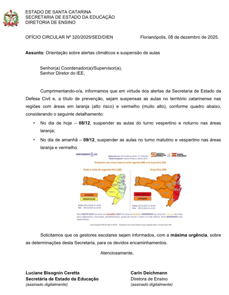A Coordenadoria Regional de Educação – 27ª CRE Lages , comunica a suspensão das aulas, em todas as escolas da rede estadual, no dia 09/12, de acordo com o Ofício Circular Nº 320/2025/SED/DIEN, em virtude dos alertas da Secretaria de Estado da Defesa Civil.