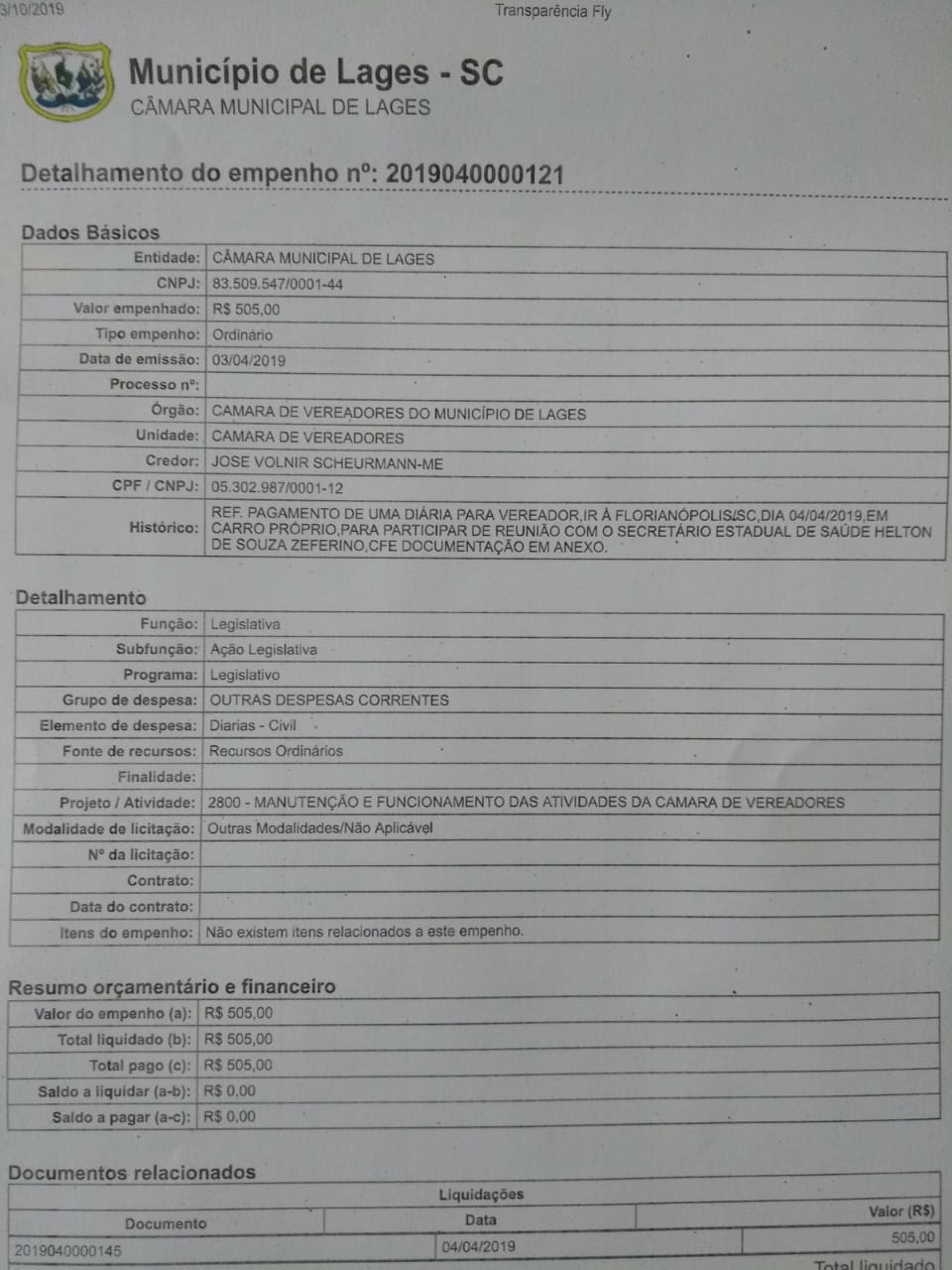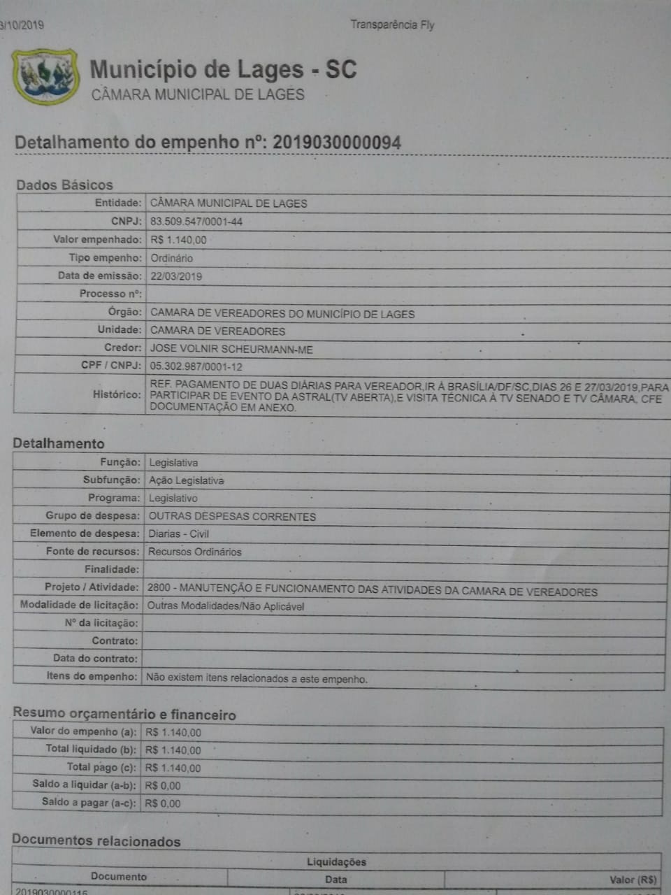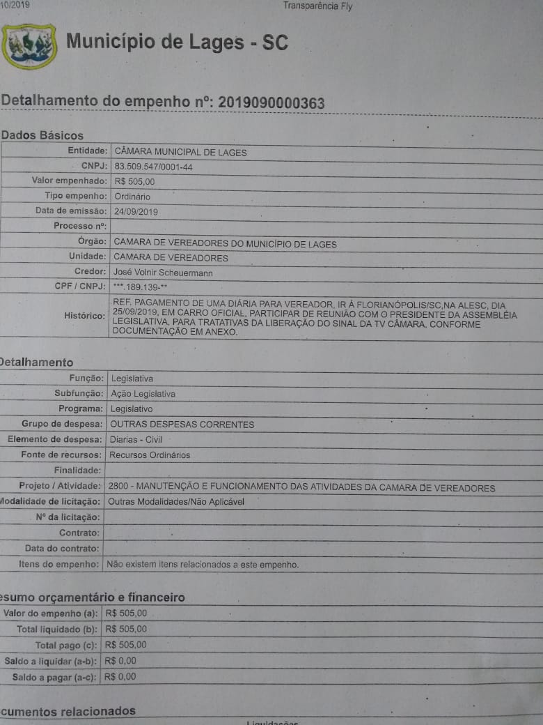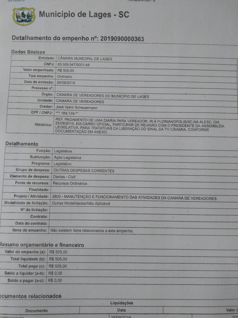 Quando o presidente da Câmara, Vone Scheuermann, viajou a Brasília no ano passado para ir em busca da concessão de um canal aberto de TV para a Câmara, as despesas da viagem foram pagas em dois diferentes empenhos. O repórter Daniel Goulart divulgou os empenhos dos mesmos valores através do CPF do vereador e outro pelo CNPJ de sua empresa.