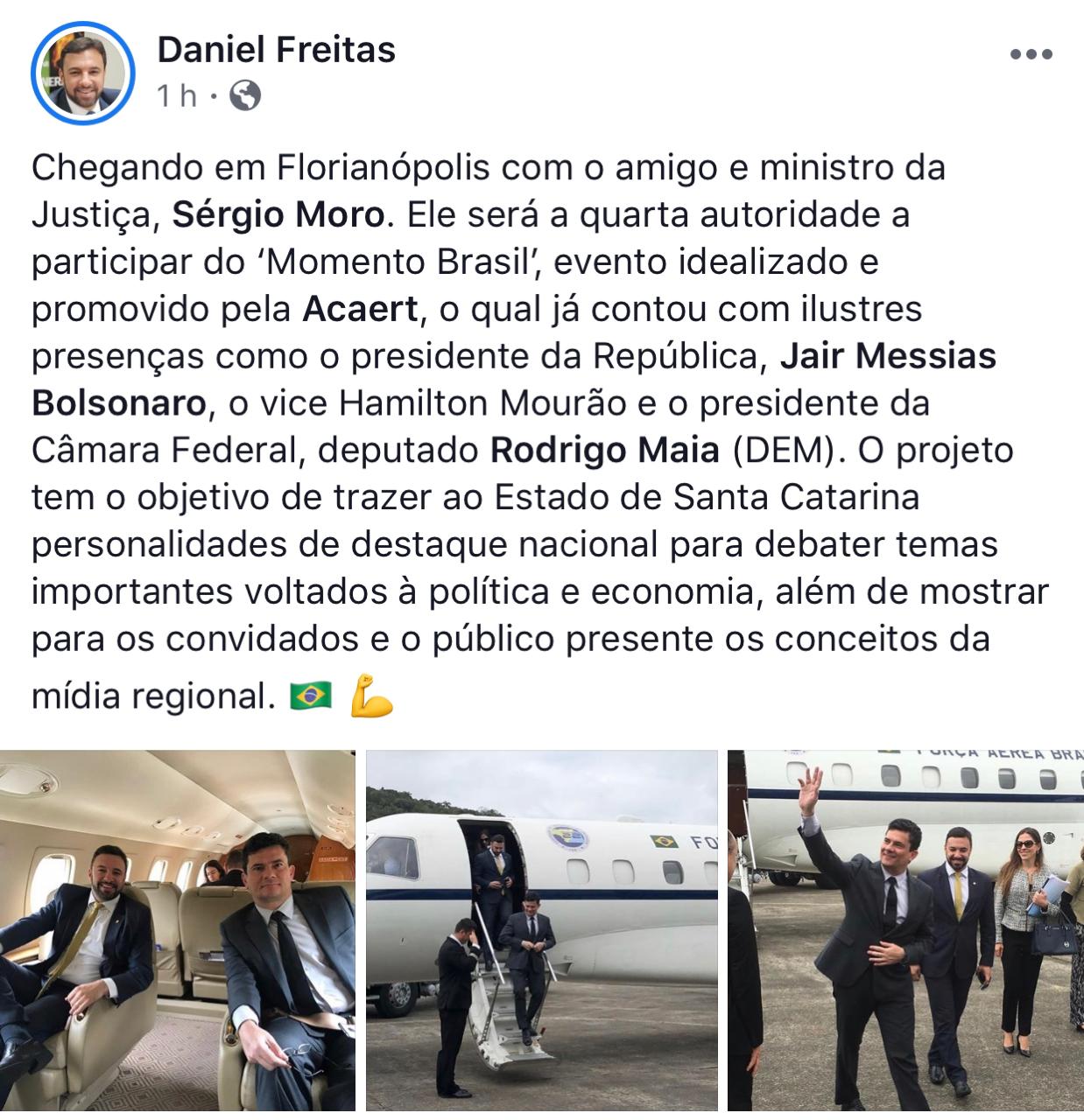 O deputado federal Daniel Freitas acompanhou o ministro Sérgio Moro em sua vinda a Florianópolis, para uma palestra na Acaert, nesta manhã de segunda-feira.