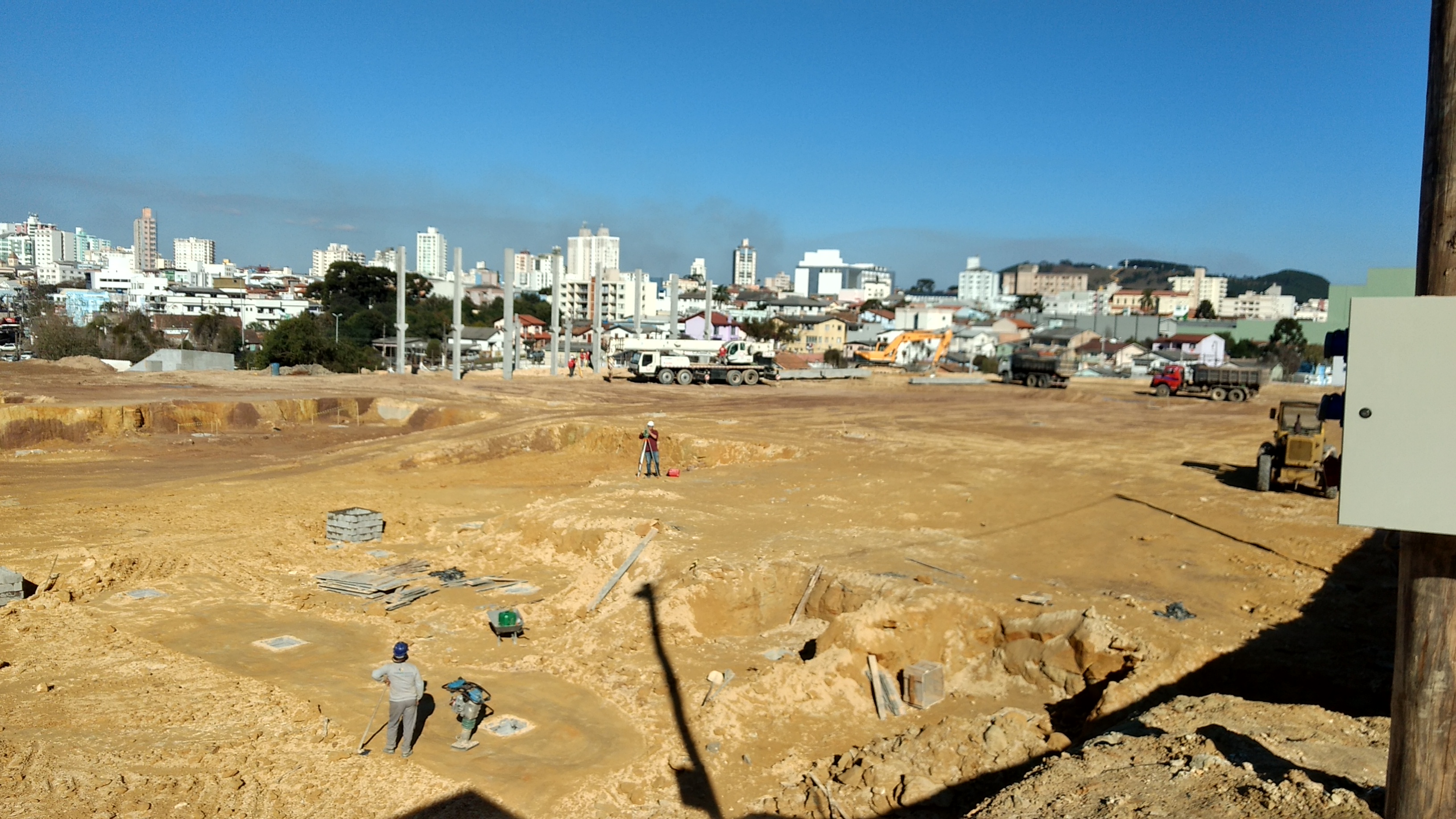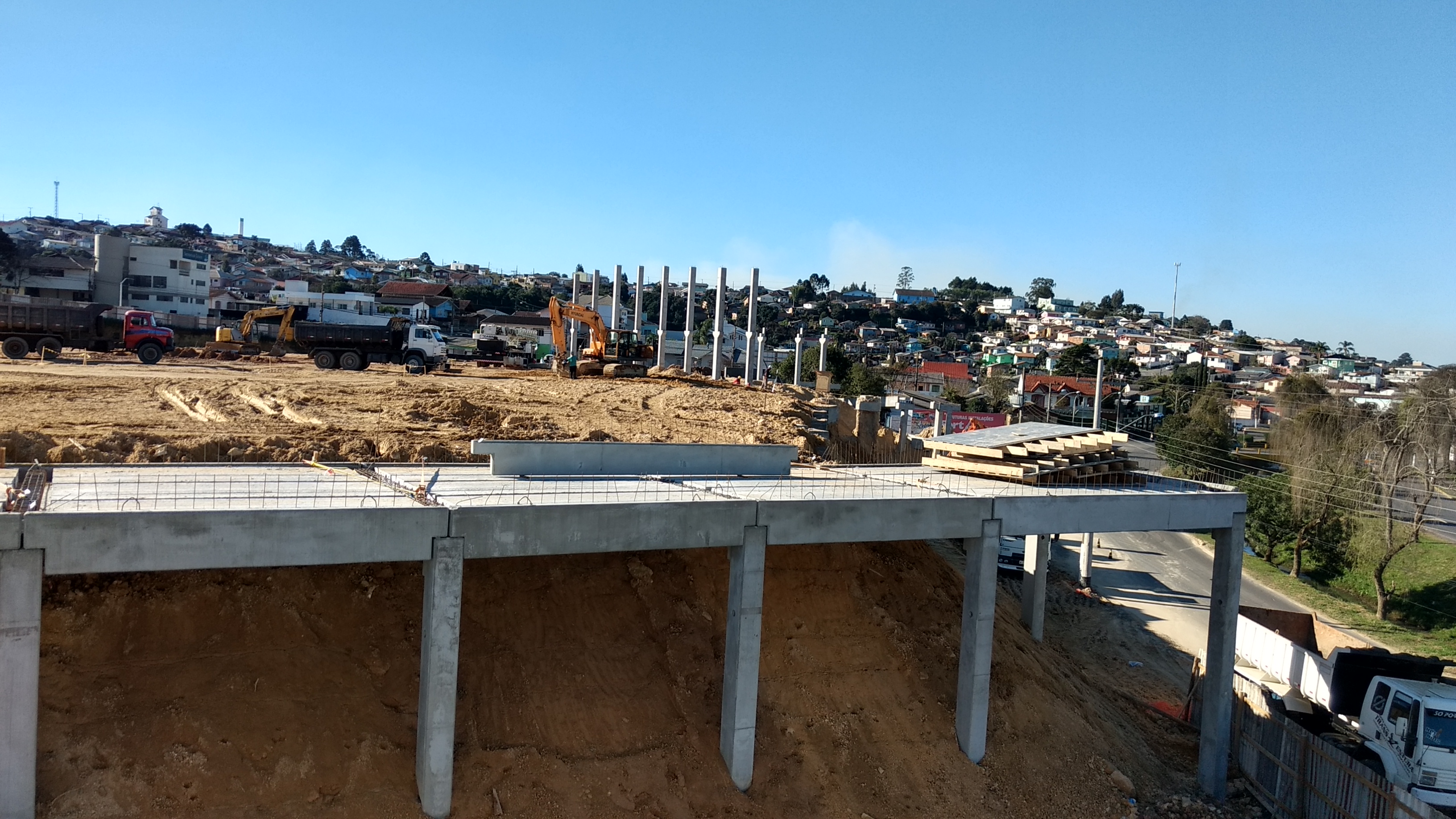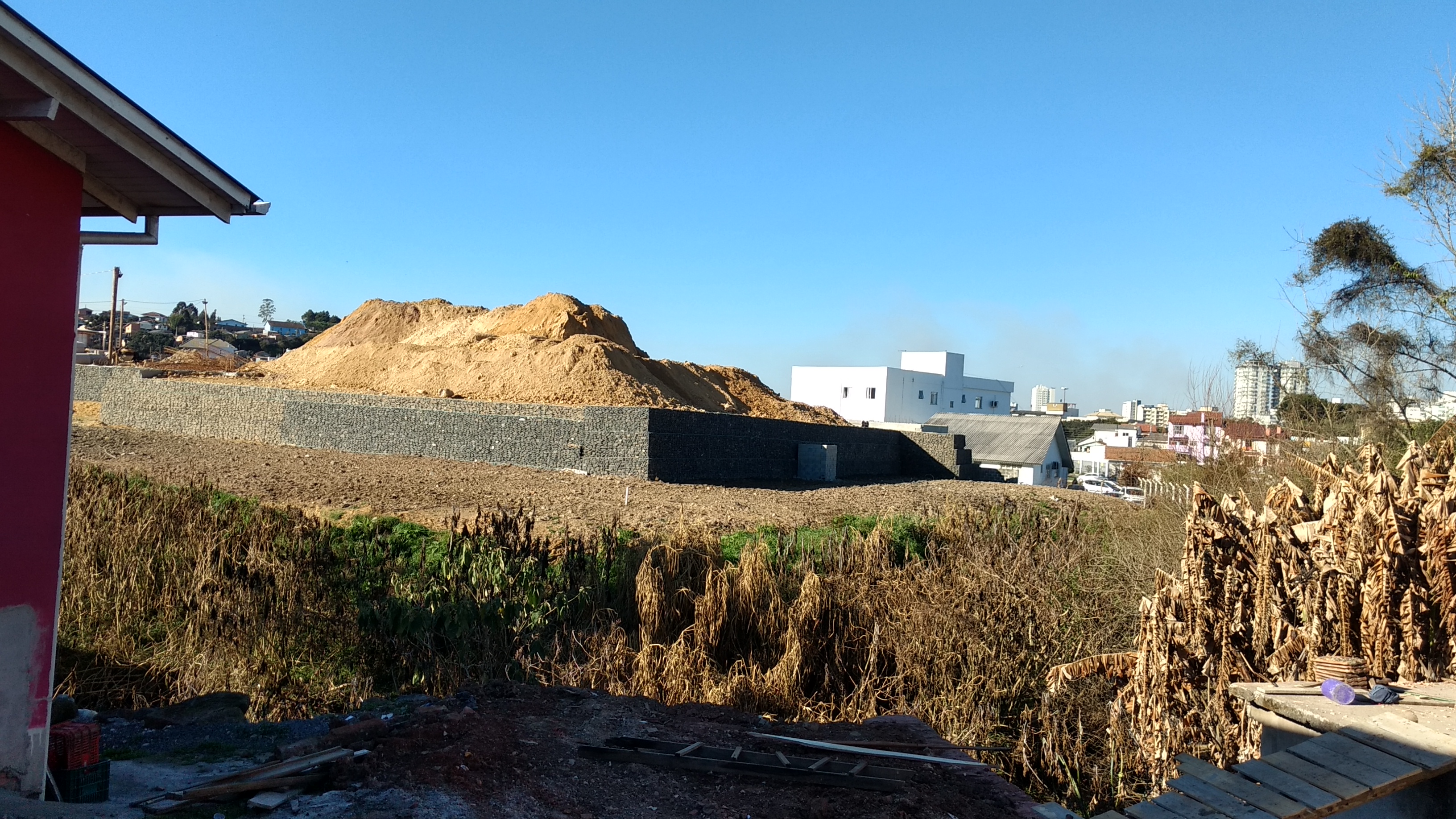 Ali está sendo levantado um muro muito alto paralelo a avenida. É muito grande a movimentação de terra pois está sendo feito um aterro.