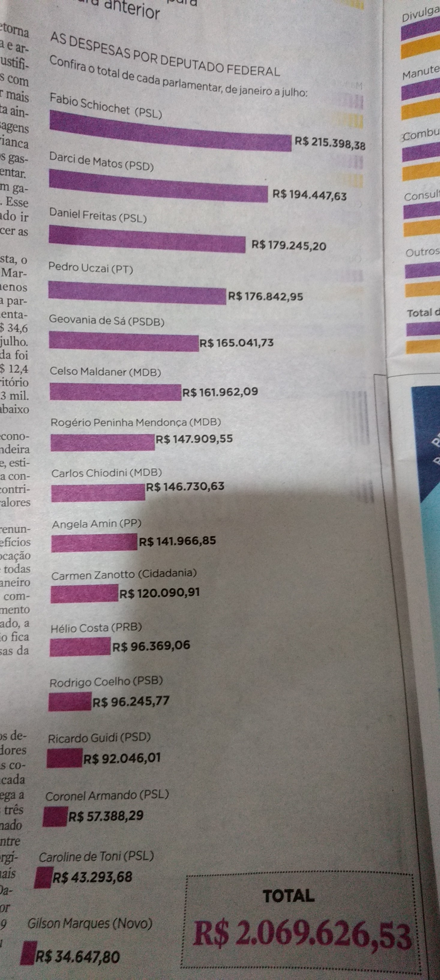 Consta que os deputados federais de SC economizaram 37% da verba para despesas de janeiro a julho deste ano em com paração ao mesmo período da legislatura anterior. O que mais gastou foi o deputado Fábio Schiochet, do PSL, seguido de Darci de Matos (PSD) e Daniel Freitas (PSL).