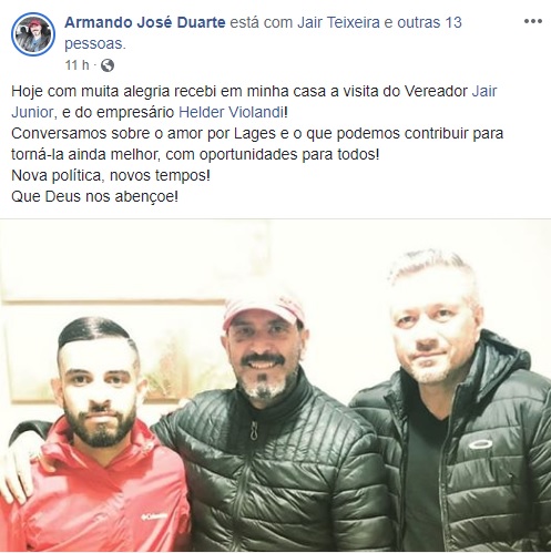 Armando José Duarte Me surpreendeu os depoimentos E manifestações de apoio ao meu nome e do Jair para Prefeito de Lages! Percebo que as pessoas estão cansadas da velha política e querem mudanças, mas, uma mudança séria e uma administração de gestão, onde o ser humano seja valorizado em sua totalidade!