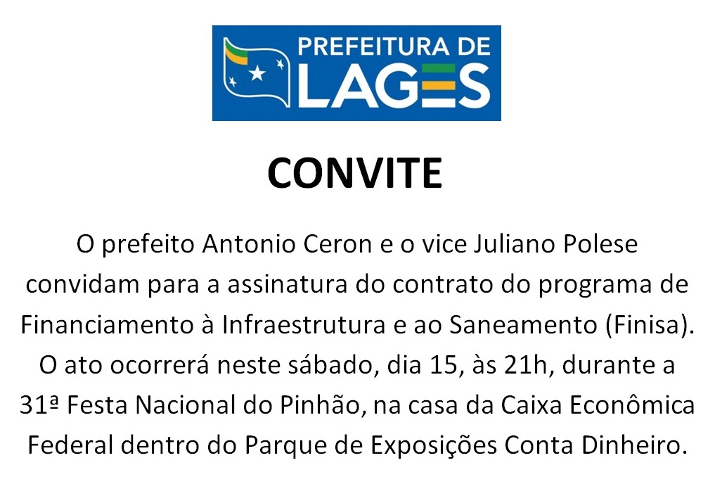 O prefeito Ceron deixou para fazer a assinatura do financiamento da Caixa (Finisa) durante a festa, pois será algo comemorado pela administração. Finalmente poderá dar andamento ao asfaltamento das ruas. São R$ 30 milhões para as ruas e R$ 5 milhões para as indenizações das obras do complexo Ponte Grande.