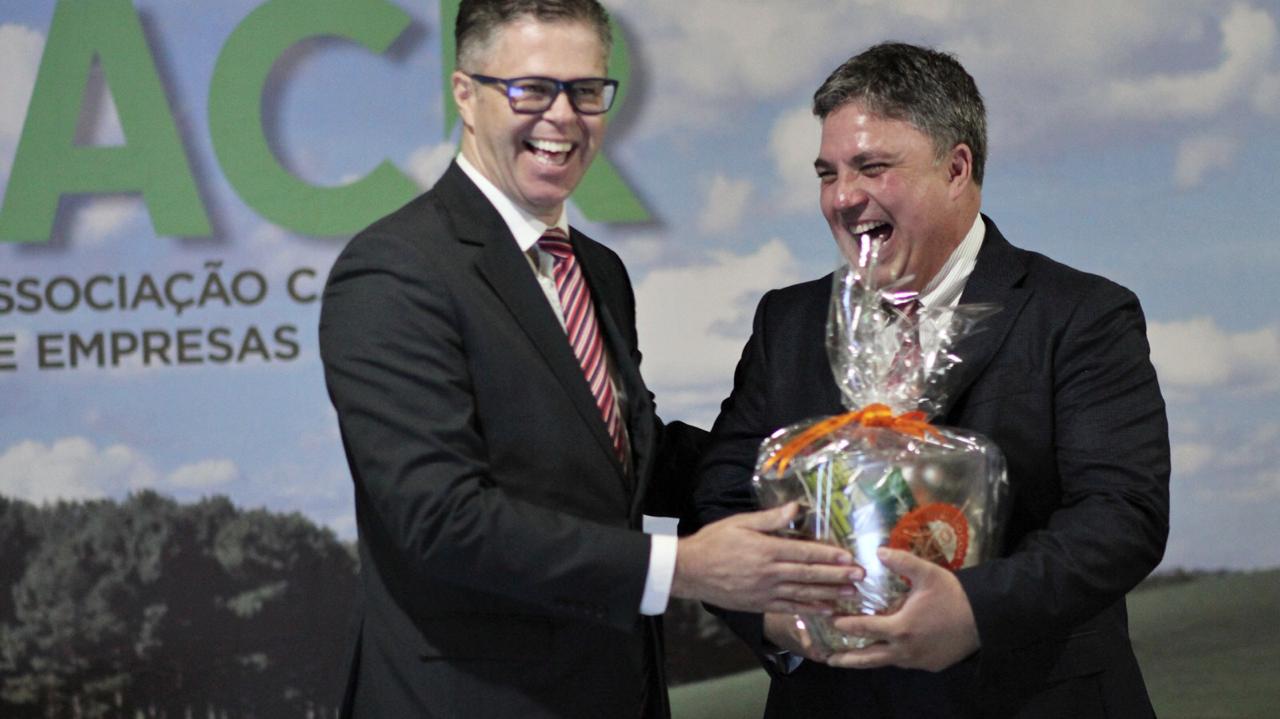 O novo presidente da Associação Catarinense de Empresas Florestais Alex Wellington dos Santos (E), de Ibirama recebeu ontem o cargo de Ali Abdul Ayoub (D). A solenidade de posse aconteceu no Serrano Tênis Clube, em Lages. Na mesma ocasião em que foi lançada a terceira edição do anuário Estatístico de base florestal de SC.