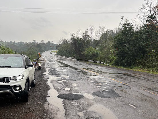 O traçado da rodovia BR-153/SC é bastante sinuoso e está apresentando a formação de trilhas de rodas nos aclives. Outro ponto que chama a atenção é a situação precária, de longa data, das juntas de dilatações da ponte sobre o Rio Uruguai.