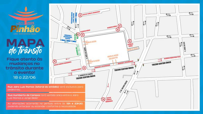 A Diretran de Lages, através da Secretaria Municipal do Planejamento Urbano (Seplam), divulgou o plano de mobilidade para os cinco dias de festa no estádio. A sinalização temporária instalada precisa de atenção dos motoristas e as alterações visam garantir maior fluidez do trânsito, organização nas vias e segurança durante o evento.