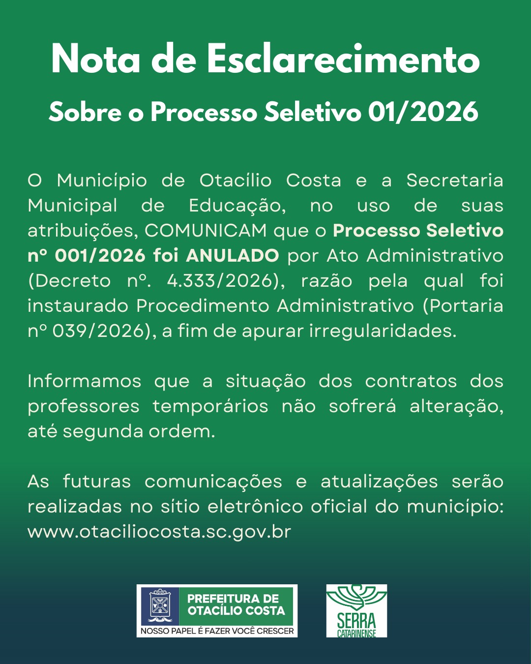 Sobre o processo seletivo de Otacílio Costa
