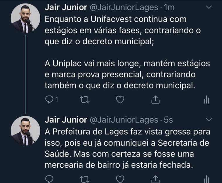 As Universidades da Serra são nosso legado e patrimônio imaterial. Não seja moleque JJ vc estudou em uma delas. Concordo com vc que a faculdade tem que dar a opção de trabalhos on-line, senão vira ditadura. Contudo pegue mais leve mercearia abre pq as pessoas precisam se alimentar assim como outras atividades essenciais. Seus argumentos nobre edil demonstra um certo bairrismo, ou seja, tudo p/ o senhor é no superlativo. Menos as vzs é mais. A elite lageana é provinciana, vi esses dias o Secretário de Turismo em um meio de comunicação pago dizer que agora mudou o mundo do trabalho, tudo é pela internet. Choveu no molhado, o home office já existia antes da pandemia, e vai continuar uma parte do trabalho, nas redes, precisou haver uma pandemia para o secretário ver o óbvio? Lages está mal na situação e oposição, não é a toa que o número de abstenções foi record no último pleito. Vulgarizou a política em Lages….e em toda Serra Catarinense de uns 10 anos pra cá só vem decaindo o nível.