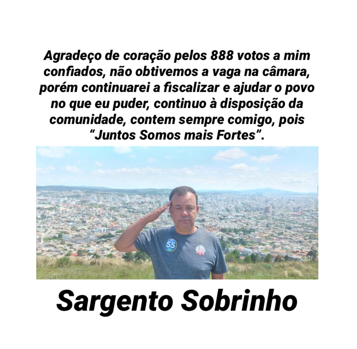Parabéns Sargento Sobrinho, sabemos de sua batalha pela população e, independe do resultado, agradeço pela disposição em continuar a ajudar o povo