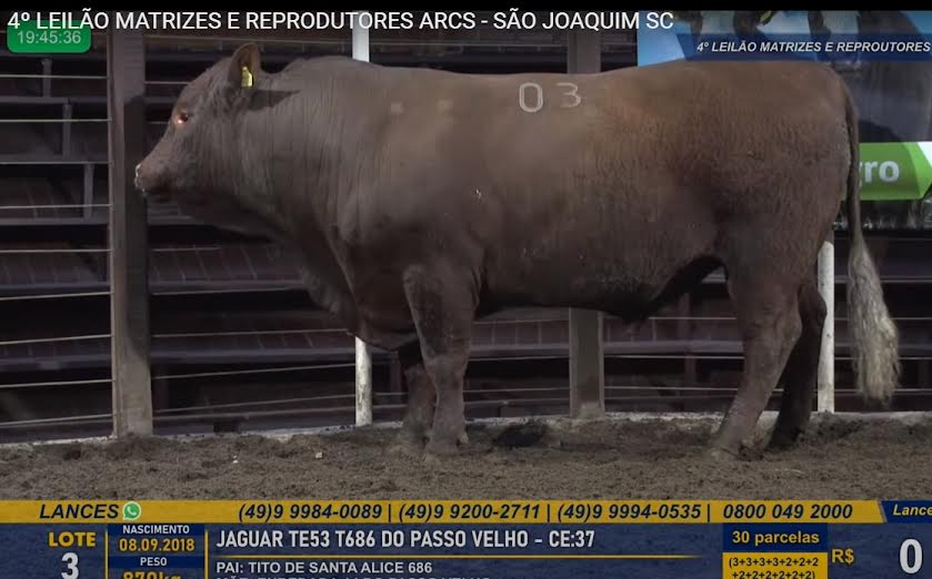 O reprodutor Jaguar TE53 T686 do Passo Velho, criação da Cabanha Passo Velho, de André Macari, de Bom Jardim da Serra (SC), foi comercializado por R$ 30mil no 4o Leilão de Matrizes e Reprodutores da Associação Regional de Cabanhas dos Campos de Cima da Serra Catarinense (ARCS). O remate foi realizado de forma virtual no domingo, 26 de setembro, direto do Parque Nacional da Maçã, em São Joaquim (SC).